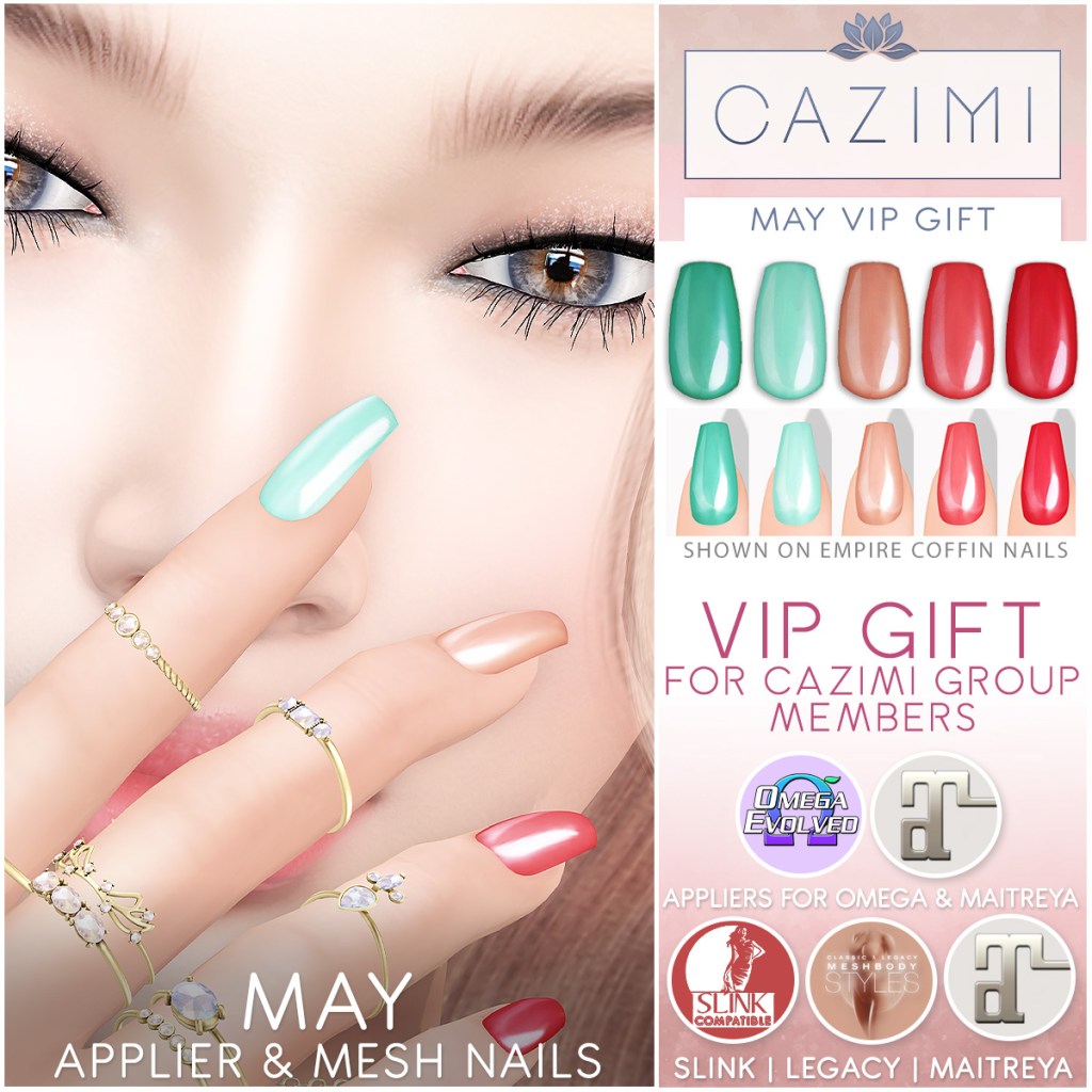 The May VIP gift is here! Mesh nails for Slink, Legacy and Maitreya and applier nails for Maitreya and Omega. Visit the main store and wear your VIP tag to get them.