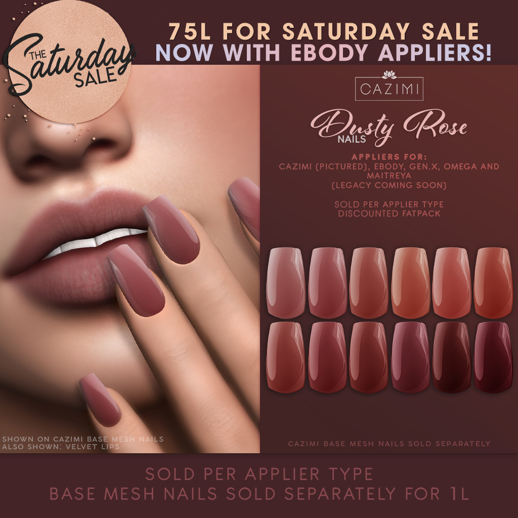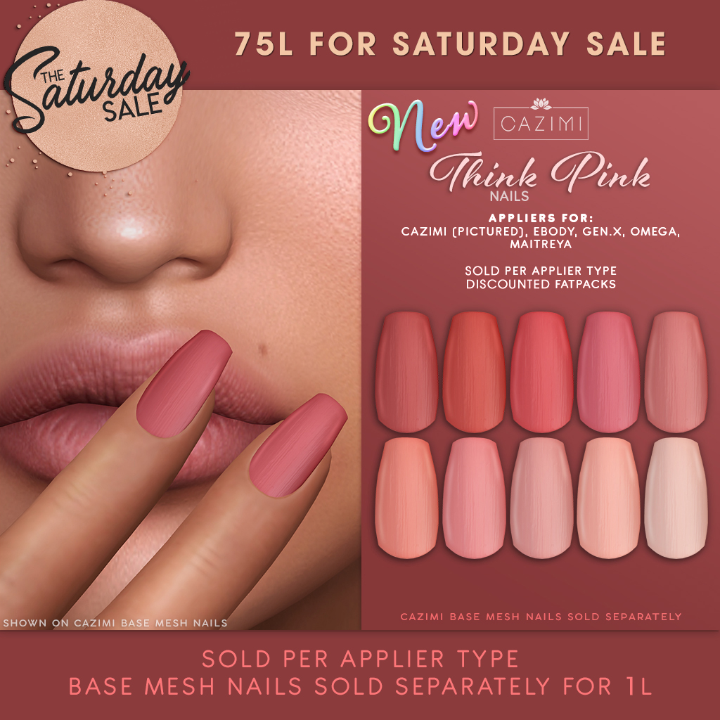 Two nail sets for Saturday Sale this week! We’ve updated the Dusty Rose nails with eBODY appliers, and we have the new Think Pink appliers. All are available for CAZIMI, eBODY, Gen.X, Omega and Maitreya appliers. 75L per applier type with discounted fatpacks. Both are available at the main store all weekend long