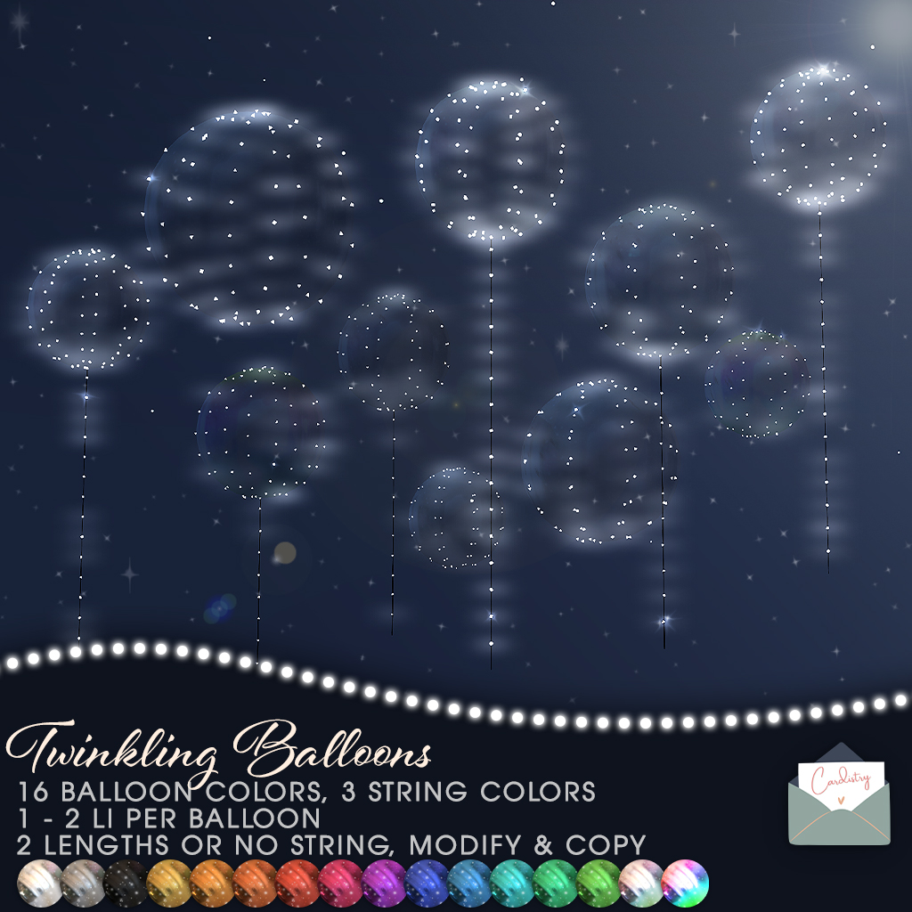 Twinkling Balloons: Mesh balloons with lights. Two string lengths or without string. Sixteen balloon colors and 3 string colors. 1-2 LI per balloon.