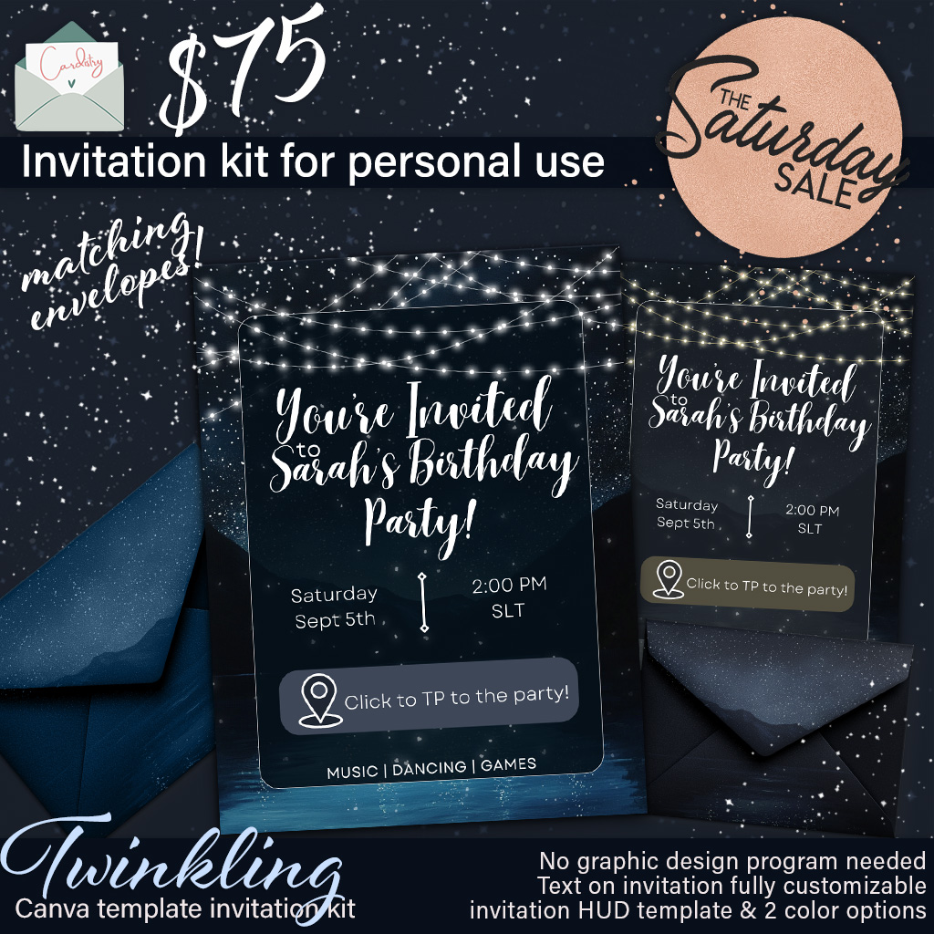 Twinkling Invitation Kit: Canva template for creating your own party/event invitations. Change all text to suit your event. Comes with two premade colors. Invitation HUD with TP button included, just add your texture and LM. Requires a free Canva account to modify.
