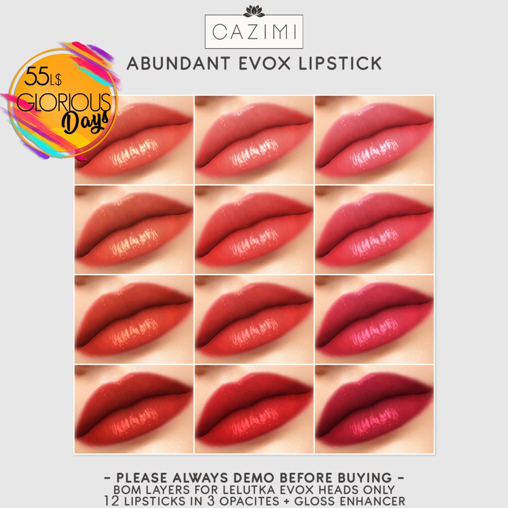 Two new EvoX BOM lipsticks and HD glitter for Lelutka Evo heads. On sale all weekend at the main store!