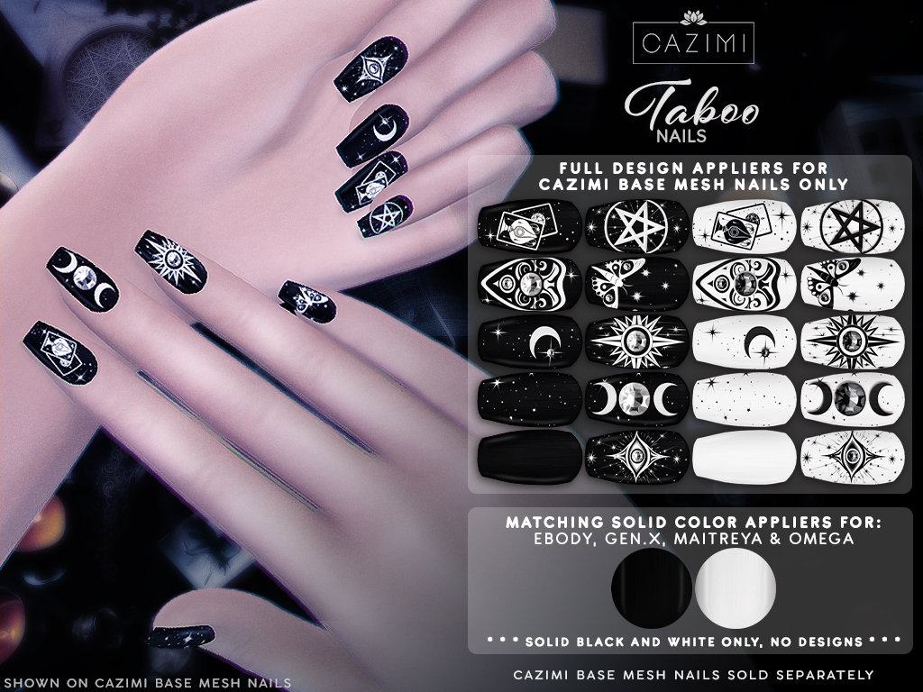 NEW Taboo nail set available at N21! This set comes with 20 nail designs for CAZIMI Base Mesh Nails. Due to the complicated designs in this set the full designs come ONLY for CAZIMI Base Mesh Nails, they are not compatible with nail appliers. The set comes with only solid black and white appliers for ebody, Gen.X, Maitreya and Omega.