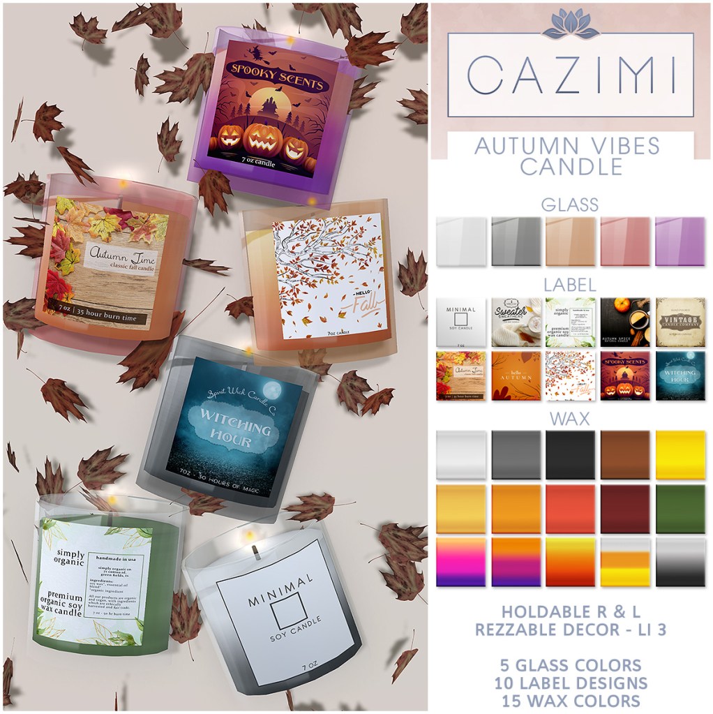 NEW for Saturday Sale, Autumn Vibes Candle. Rezzable decor and holdable version with bento hold animation for left and right hands. Texture change HUD includes 5 glass color, 10 label styles and 15 waxes to suit your style. From minimalist to classic to all out Halloween lover! Just 75L all weekend at the main store.