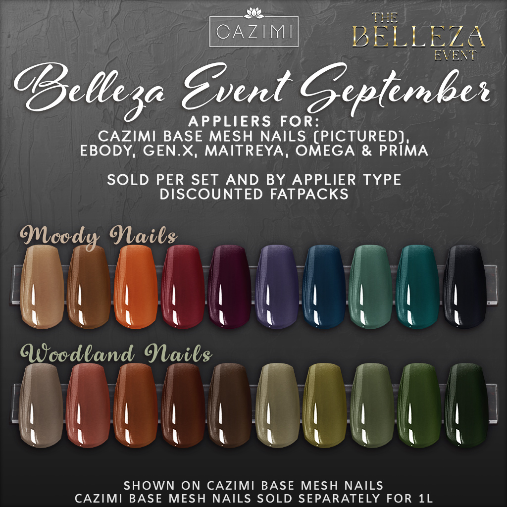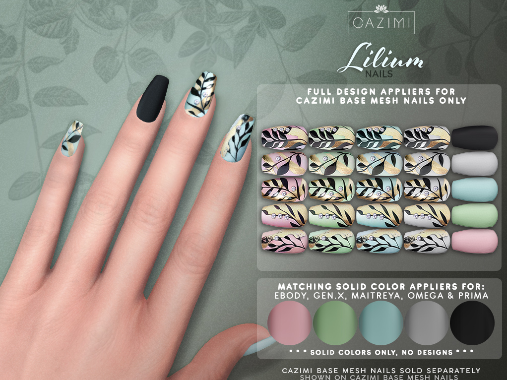 Base Mesh Nails sold separately for 1L and come rigged for Anatomy, eBODY Reborn, Belleza Gen.X, Inithium Kupra, Meshbody Legacy, Maitreya Lara and LaraX, Prima, SelinA and Slink.