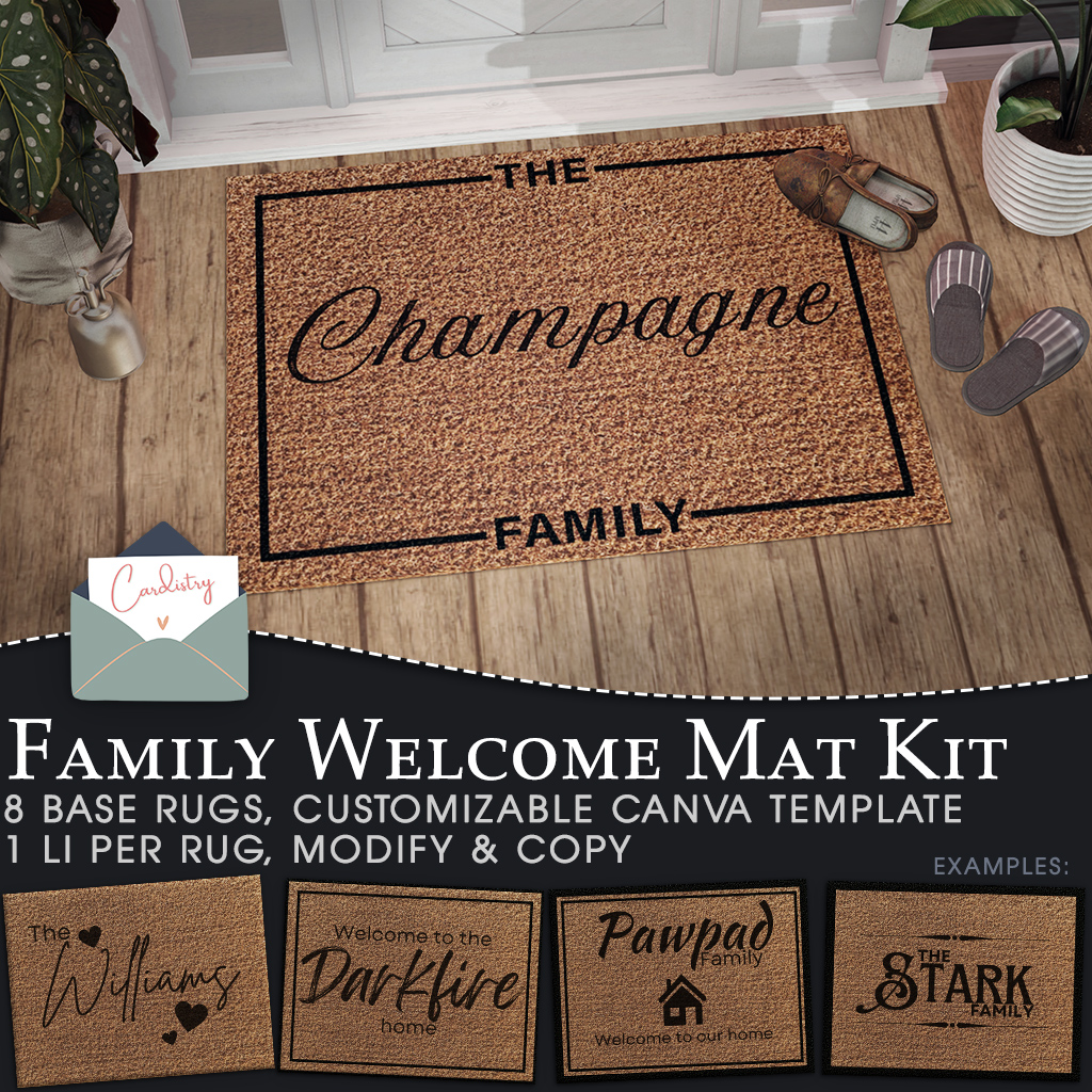 Cardistry Welcome Mats: Basic Welcome Mat comes with 6 designs without text. Family Welcome Mat Kit has 8 designs and comes with a Canva template link to personalize with your family name. You can choose your font and add or remove graphics like hearts or a house.