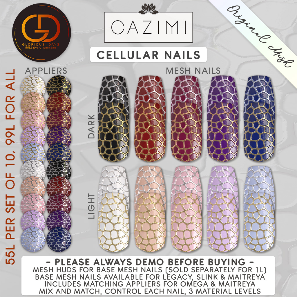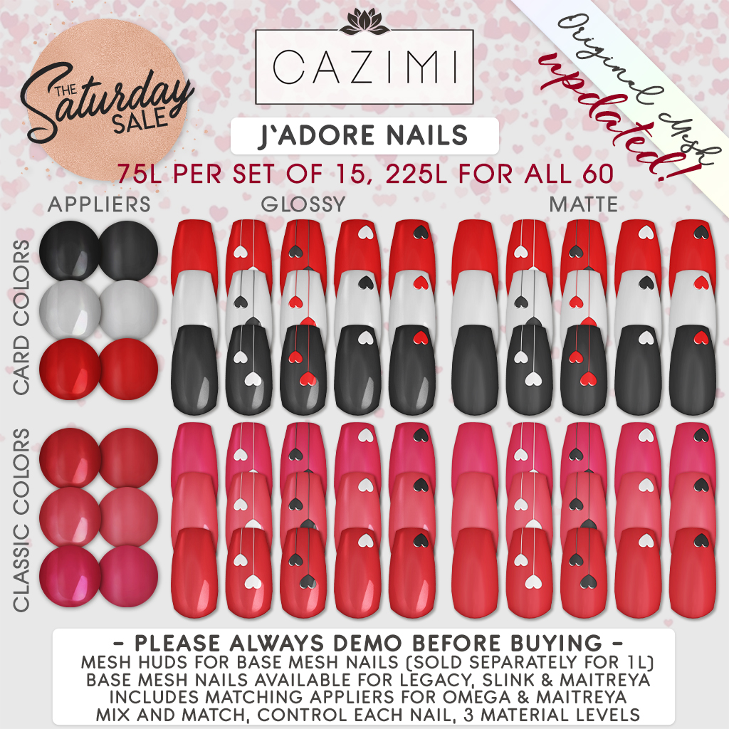 Snowflake Nails: 87L for the fatpack only! Ten colors in matte or glossy. Includes mesh polish HUD for the CAZIMI Base Mesh Nails and Omega & Maitreya appliers.