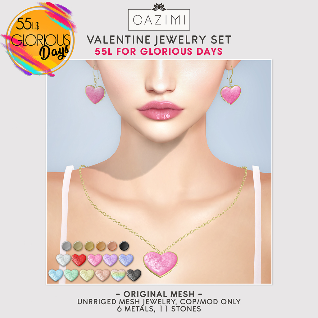Valentine Jewelry Set: Unrigged mesh jewelry with 6 metals and 11 stone colors. Copy/mod only. 55L for Glorious Days this weekend.