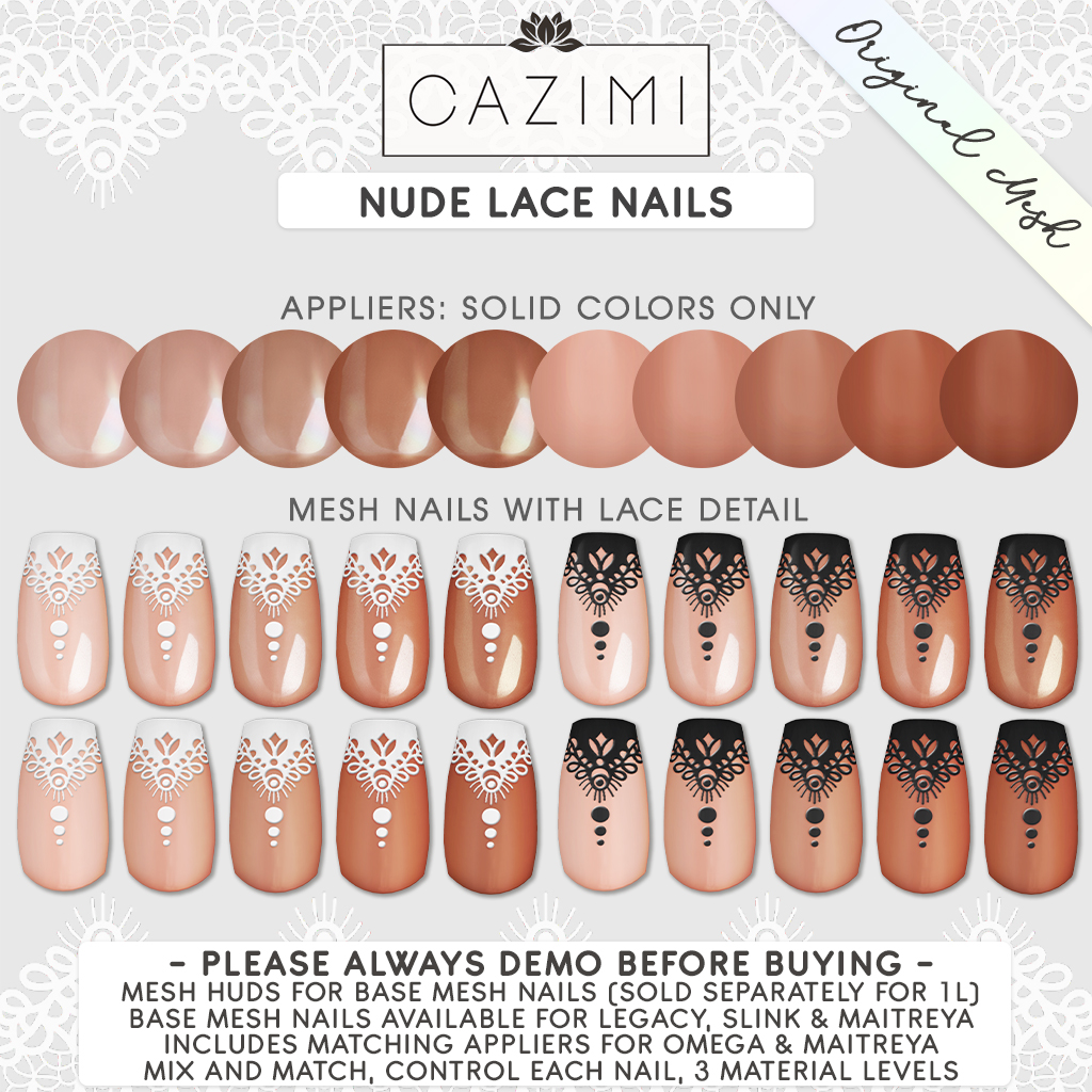 I also have another pack of nails, Nude Lace, for Skin Fair. If you haven’t tried my mesh nails yet they are currently rigged for Maitreya, Slink and Legacy bodies. I’ve included the demo for the base mesh nails so you can try them out. The base mesh nails are only $1L and you get 10 starter colors. All my mesh nail sets work with them and you can mix and match.