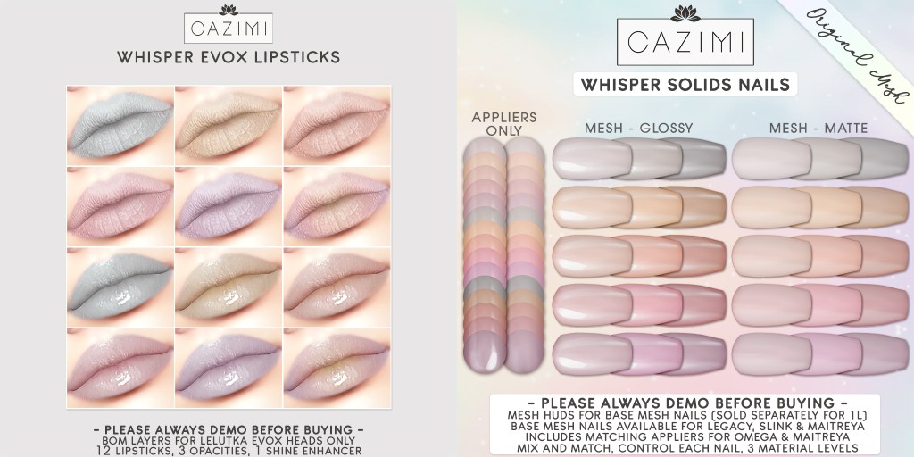 💠 Whisper Lips: 6 pale pastel colors in matte or glossy. 3 opacities as usual, and works on Lelutka EvoX heads in EvoX mode only. 💠 Whisper Nails: 15 colors in matte or glossy. Mesh nails come with matching appliers, or appliers are available separately.