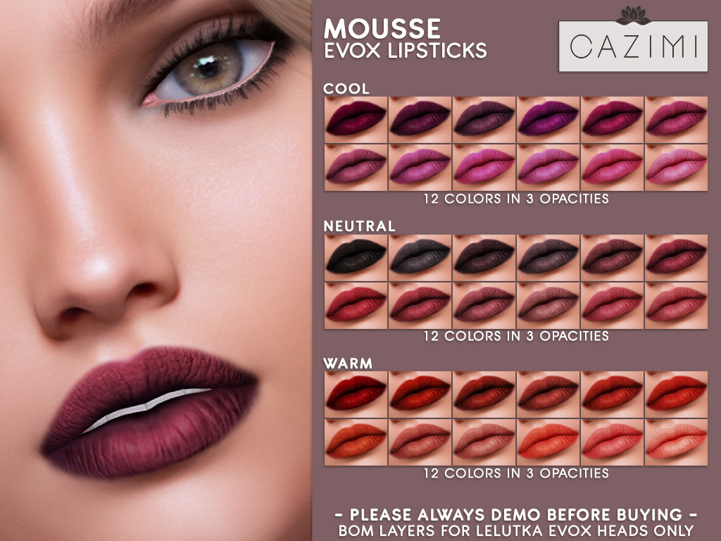 Mousse EvoX Lipstick: 75L per set 0f 12 colors, 199 for all 3 packs. NEW!