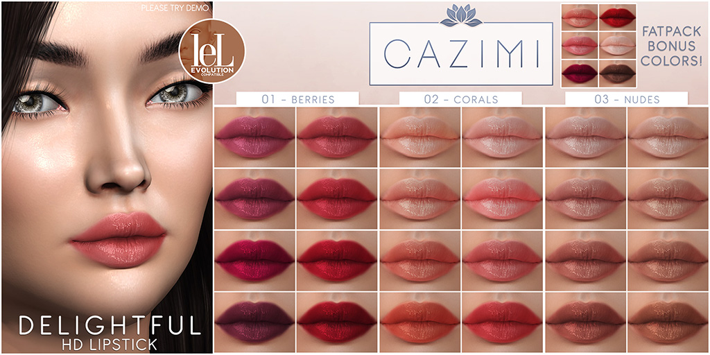 HD lipstick megapack for Lelutka Evolution heads, available at Pretty which opened today. These lipsticks are delicate and glossy. Choose from 3 color packs: berries, corals and nudes, or buy the fatpack and get an additional 6 bonus lip colors.
