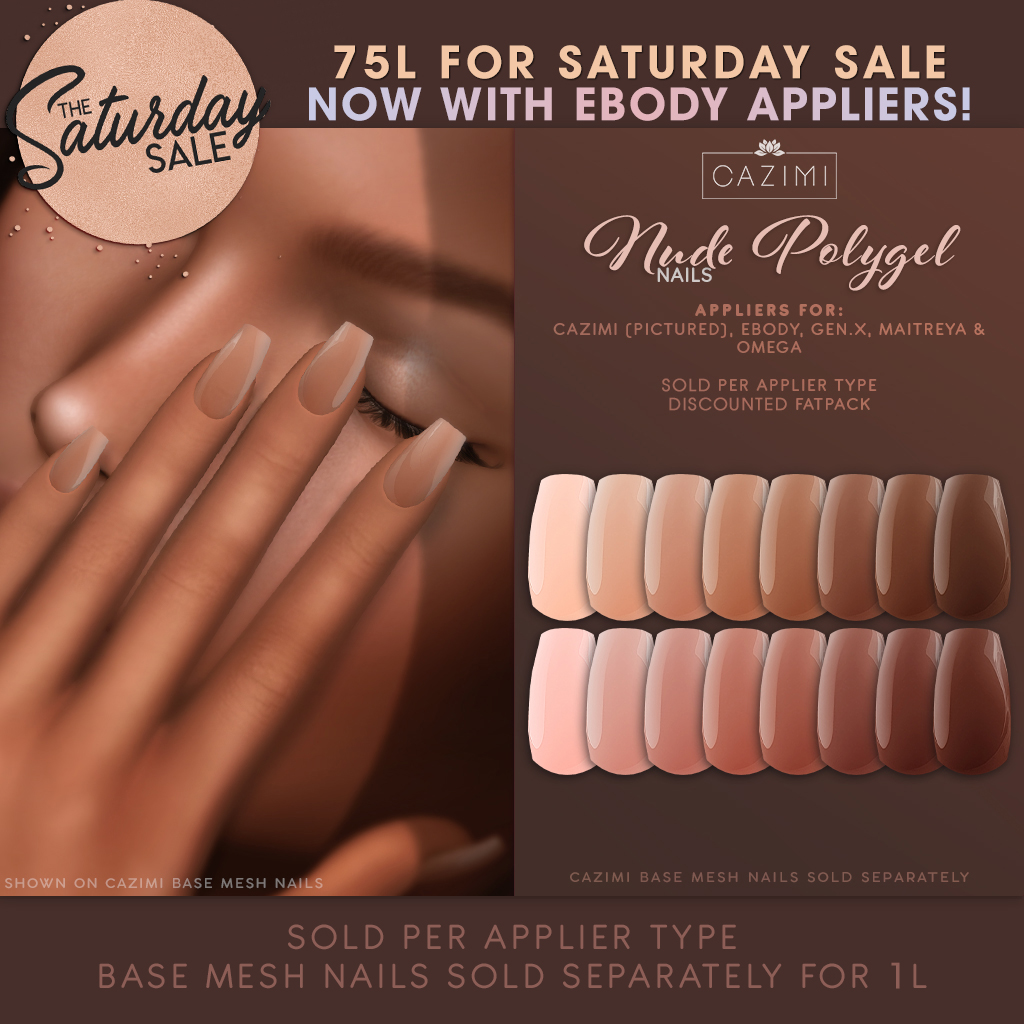 NEW at The Saturday Sale Anniversary Event, the Noods nails! Ten matte skintone nail colors for CAZIMI, Ebody, Gen.X, Omega and Maitreya. Each applier pack is only 75L! We also have a gift available, the Lucid eyes. Be sure to wear your Saturday Sale group tag to get the gifts!